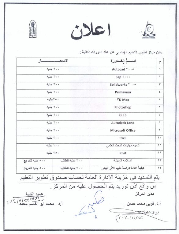 يعلن مركز تطوير التعليم الهندسى عن عقد دورات 25 نوفمبر 2014 يعلن مركز تطوير التعليم الهندسى عن عقد دورات