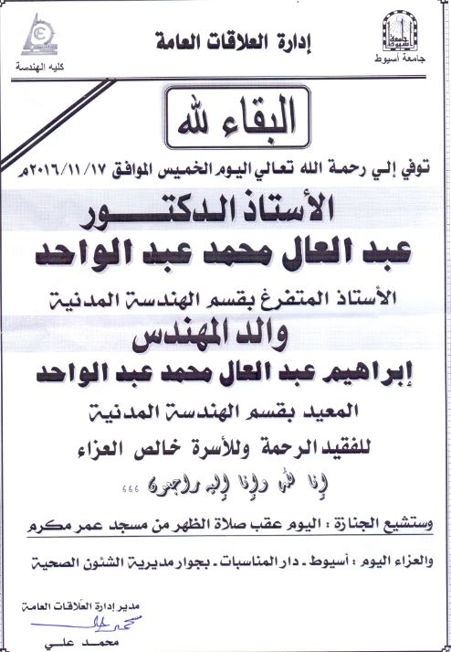 توفى إلى رحمة الله تعالى اليوم الخميس الموافق 17-11-2016 الأستاذ الدكتور/ عبدالعال محمد عبد الواحد، الأستاذ المتفرغ بقسم الهندسة المدنية ووالد المهندس إبراهيم عبد العال، المعيد بقسم الهندسة المدنية و ستشيع الجنازة اليوم عقب صلاة الظهر من مسجد عمر مكرم وسيقام العزاء اليوم فى دار المناسبات بجوار مديرية الصحة