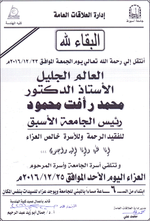 عزاء واجب فى وفاة رئيس الجامعة الاسبق الأستاذ الدكتور / محمد رأفت محمود 25 ديسمبر 2016 عزاء واجب فى وفاة رئيس الجامعة الاسبق الأستاذ الدكتور / محمد رأفت محمود