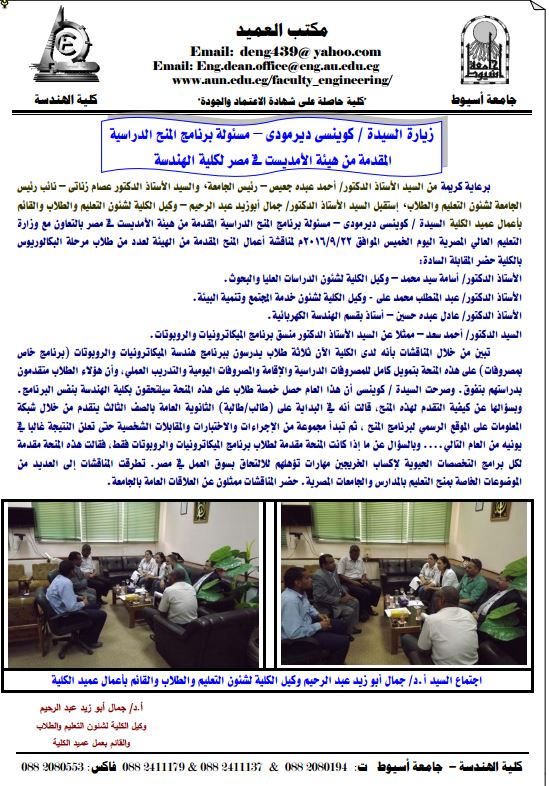 برعاية كريمة من السيد الأستاذ الدكتور/ أحمد عبده جعيص – رئيس الجامعة، والسيد الأستاذ الدكتور عصام زناتى – نائب رئيس الجامعة لشئون التعليم والطلاب، إستقبل السيد الأستاذ الدكتور/ جمال أبوزيد عبد الرحيم – وكيل الكلية لشئون التعليم والطلاب والقائم بأعمال عميد الكلية السيدة / كوينسى ديرمودى – مسئولة برنامج المنح الدراسية المقدمة من هيئة الأمديست فى مصر بالتعاون مع وزارة التعليم العالي المصرية اليوم الخميس الموافق ٢٠١٦/٩/٢٢م لمناقشة أعمال المنح المقدمة من الهيئة لعدد من طلاب مرحلة البكالوريوس بالكلية حضرالمقابلة السادة:الأستاذا لدكتور/ أسامة سيد محمد – وكيل الكلية لشئون الدراسات العليا والبحوث، الأستاذالدكتور/ عبدالمنطلب محمد على - وكيل الكلية لشئون خدمة المجتمع وتنمية البيئة، الأستاذ الدكتور/ عادل عبده حسين – أستاذ بقسم الهندسة الكهربائية، السيدالدكتور/ أحمد سعد – ممثلا عن السيد الأستاذ الدكتورمنسق برنامج الميكاترونيات والروبوتات