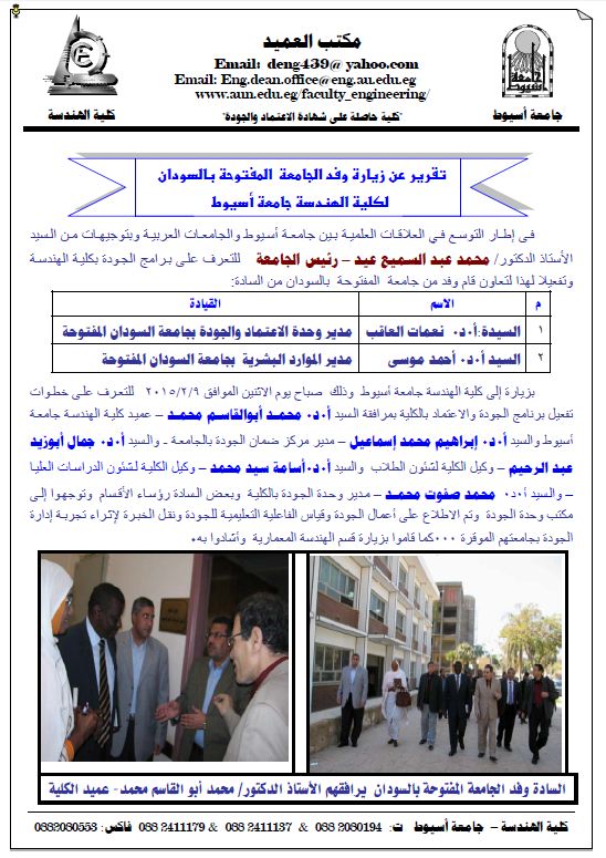 فى اطارالتوسع بين جامعة أسيوط والجامعات العربية وبتوجيهات من السيد الأستاذ الدكتور/ محمد عبد السميع عيد – رئيس الجامعة للتعرف على برامج الجودة بكلية الهندسة وتفعيلا لھذا التعاون قام وفد من الجامعة المفتوحة بالسودان بزيارة الى كلية الهندسة جامعة أسيوط