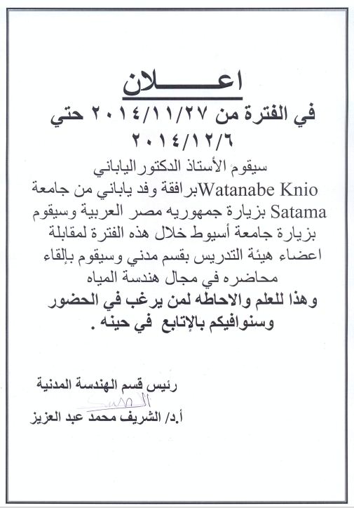 فى الفترة من 27/11/2014 حتى 6/12/2014 سيقوم الأستاذ الكتور اليابانى watanabe Knio يرافقه وفد يابانى من جامعة Satama بزيارة جمهورية مصر العربية وسيقوم بزيارة جامعة أسيوط خلال هذه الفترة لمقابلة اعضاء هيئة التدريس بقسم مدنى وسيقوم بالقاء محاضرة فى مجال هندسة المياة