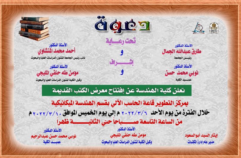2022-03-06 من الساعة التاسعة صباحا حتى الثانية ظهرا Thu, 10 Mar 2022 - 12:00 At the Development Center in the Computer Hall of the Mechanical Engineering Department The College of Engineering announces the opening of the Old Books Exhibition