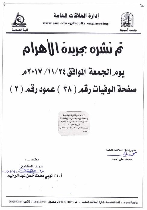 Condolences for the death of the daughter of Prof. Dr. Mohamed El Shafei Abdullatif 26 November 2017 Condolences for the death of the daughter of Prof. Dr. Mohamed El Shafei Abdullatif