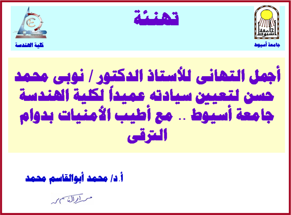 Congratulation to Prof. Dr. Nubi Mohamed Hassan for appointment as Dean of the Faculty of Engineering Assiut University with best wishes for promotion 23 November 2017 Congratulation to Prof. Dr. Nubi Mohamed Hassan for appointment as Dean of the Faculty of Engineering Assiut University with best wishes for promotion