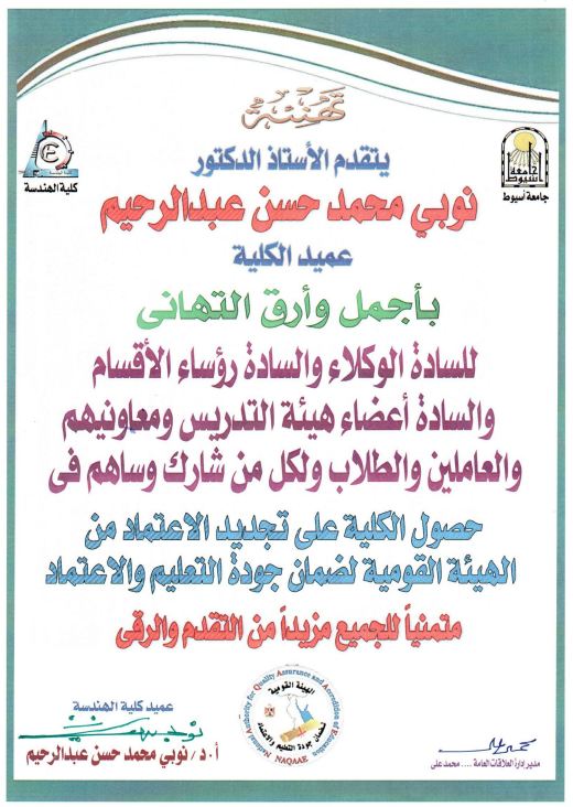 Congratulations from the Dean of the Faculty of Engineering, University of Assiut on the occasion of the college acquisition of accreditation from the National Quality Assurance Authority