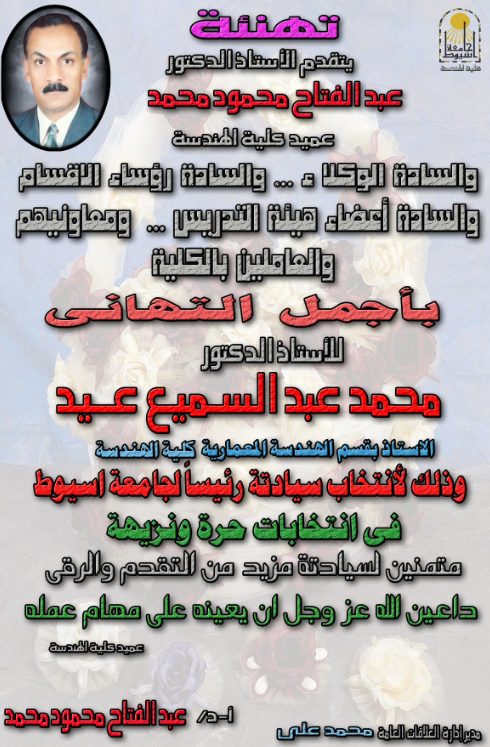 The dean of the faculty and the whole staff congratulate professor Muhammad Abd El-Samie for being elected as the president of assiut university wishing him all the best in his new position.
