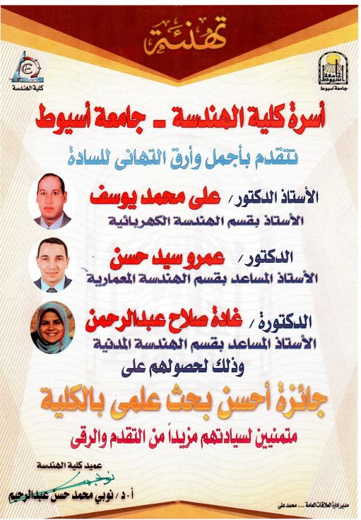 The Family of the College of Engineering of Assiut UniversityWith the most beautiful and gentle congratulations to the gentlemenProf. Dr. Ali Mohammed YusufDr. Amr Sayed HassanDr. Ghada Salah Abdel Rahman And that's because they get Best Scientific Research Award in CollegeWishing their sovereignty further progress and sophistication.Dean of the Faculty of EngineeringProf. Dr. Nobbe Mohammed Hassan