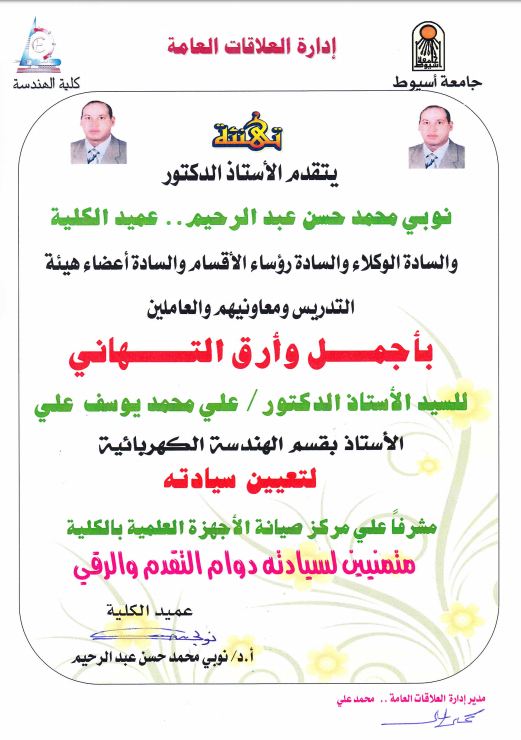 Congratulations from the Faculty of Engineering to Dr. Ali Mohamed YousefOn the occasion of appointing his Lordship as supervisor of the Center for the maintenance of scientific organs in the college