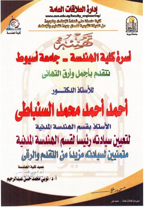 Congratulations from the family of the Faculty of Engineering to Mr. A.D. Ahmed Ahmed Mohammed Al-Sinbati on the occasion of his appointment as head of the Civil Engineering Department