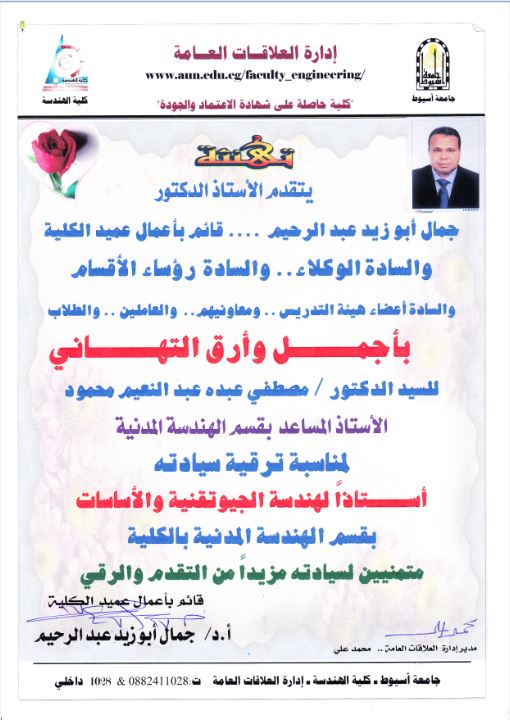 Congratulations from the family of faculty of engineering to Prof. Dr. Mustafa Abdo Abdel Naeem for his professorship 17 July 2017 Congratulations from the family of faculty of engineering to Prof. Dr. Mustafa Abdo Abdel Naeem for his professorship