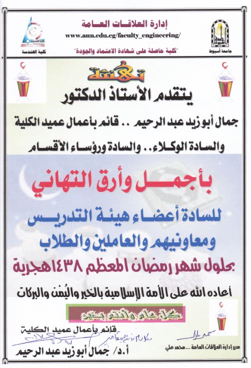 Prof. Dr. Jamal Abu Zeid Abdel Rahim, acting Dean of the faculty, Messrs. And deputy heads of department with the nicest congratulations to the Masters members of the faculty and their assistants and the workers and students in the occasion of the blessed month of Ramadan