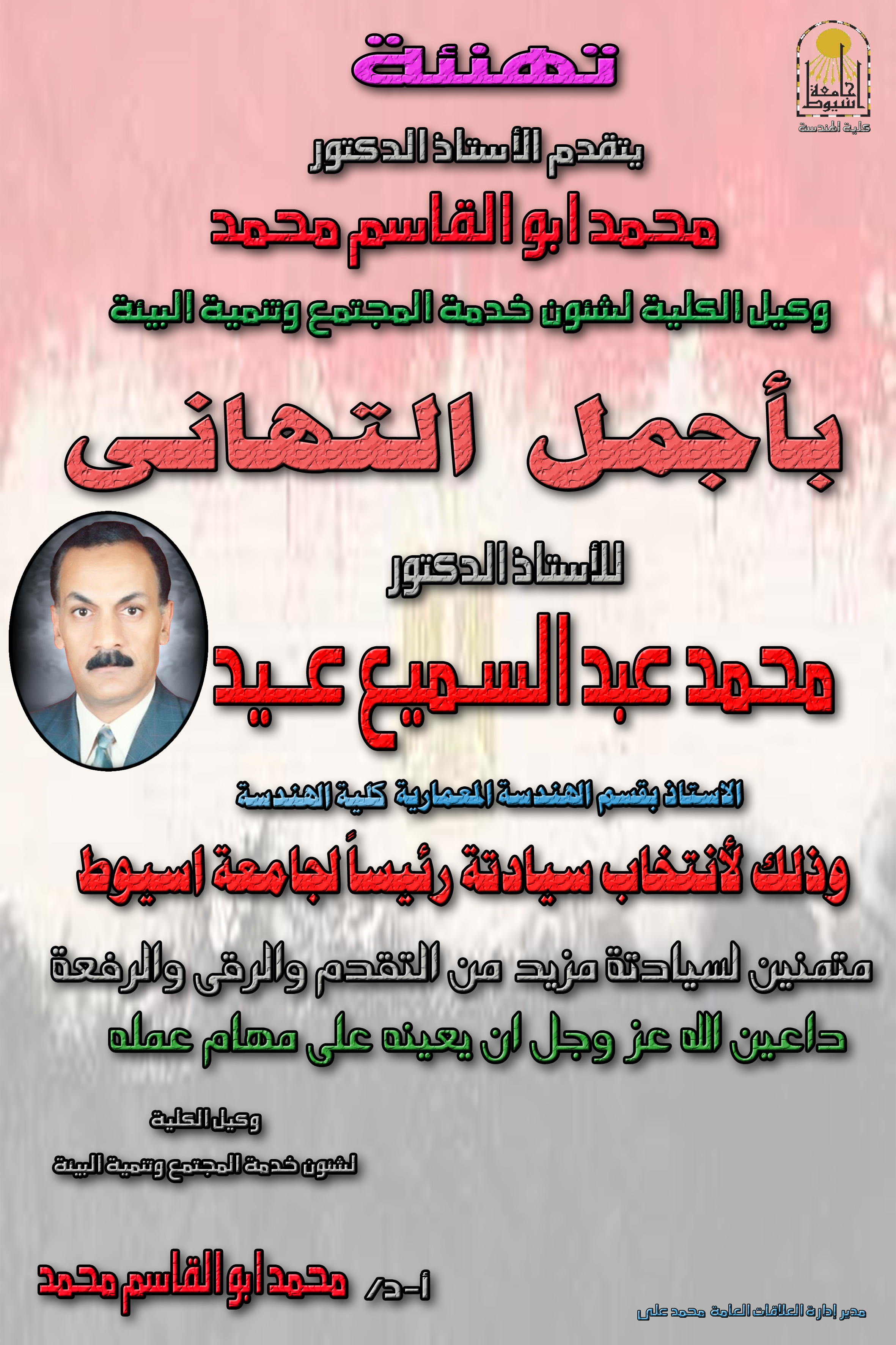 The vice dean for community service and environmental development professor Muhammad Abo El-Kassem Muhammad congratulates professor Muhammad Abd El-Samie for being elected as the president of assiut university wishing him all the best in his new position.