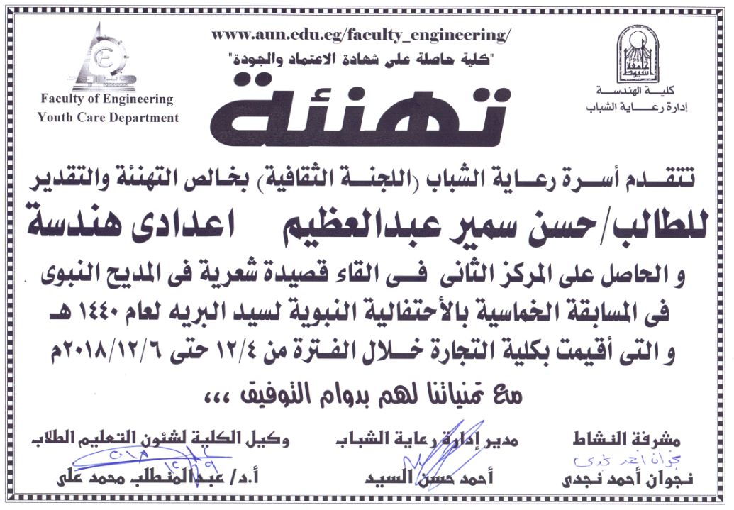 Congratulations from the youth welfare family to the student Hassan Samir Abdul Azim, who holds the second place to shed poems 9 December 2018 Congratulations from the youth welfare family to the student Hassan Samir Abdul Azim, who holds the second place to shed poems