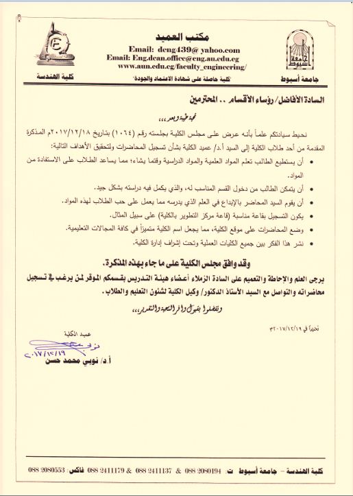 At its 1064th meeting, on 18-12-2017 May, the Board of the Faculty of Engineering approved the commencement of the registration of college lectures on a engineering site at the request of a student. So please circulate and take a briefing to the faculty members of the sections for those who wish to record their lectures and to communicate with Mr. Prof. Dr./Vice Dean for Education and student affairs.