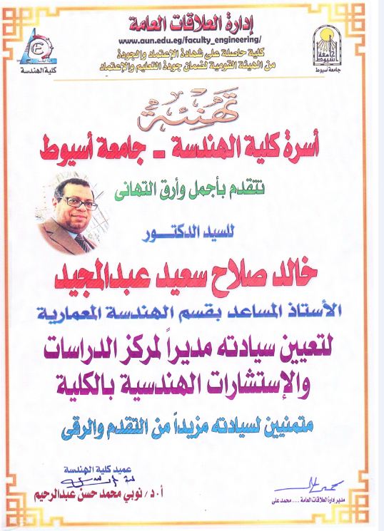Dr. Khalid Salah Saeed, Assistant Professor in the Department of Architecture, appointed director of the Center for Engineering Studies and Consultancy