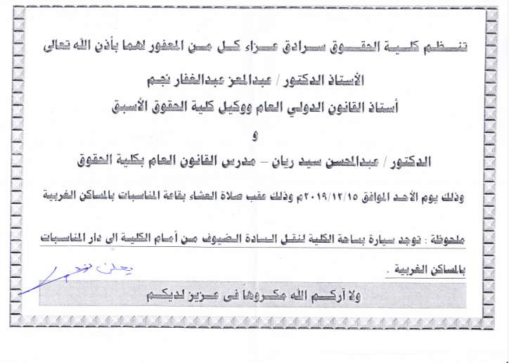 The Law School organizes a funeral marquee for:Prof. Dr. Abdul Mu'izz Abdul Ghaffar NajmProfessor of Public International Law and Former Solicitor of the Faculty of LawAndDr. Abdul Mohsen Sayed RyanPublic Law Teacher, Law SchoolOn Sunday, 15-12-2019, after the evening prayer supper in the West Housing Ballroom.Note: There is a car in the college yard to transport the comforting gentlemen in front of the college to the event house