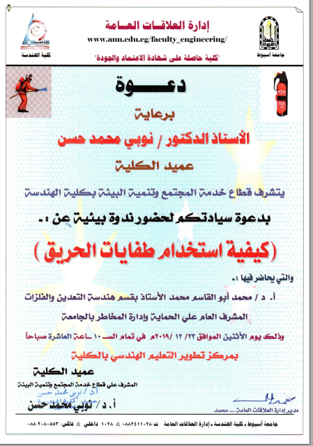 Under the auspices of Mr. Dr. Nobby Mohammed HassanDean of the Faculty of EngineeringThe Community Service and Environmental Development Sector at the Faculty of Engineering is honored to invite you to attend an environmental symposium on:How to use fire extinguishersWhich he lectures in:Prof. Mohammed Abu Qasim Mohammed, Professor, Department of Mining and Metals Engineering and General Supervisor of Protection and Risk Management at the UniversityOn Monday, 23-12-2019 at 10:00 a.m.