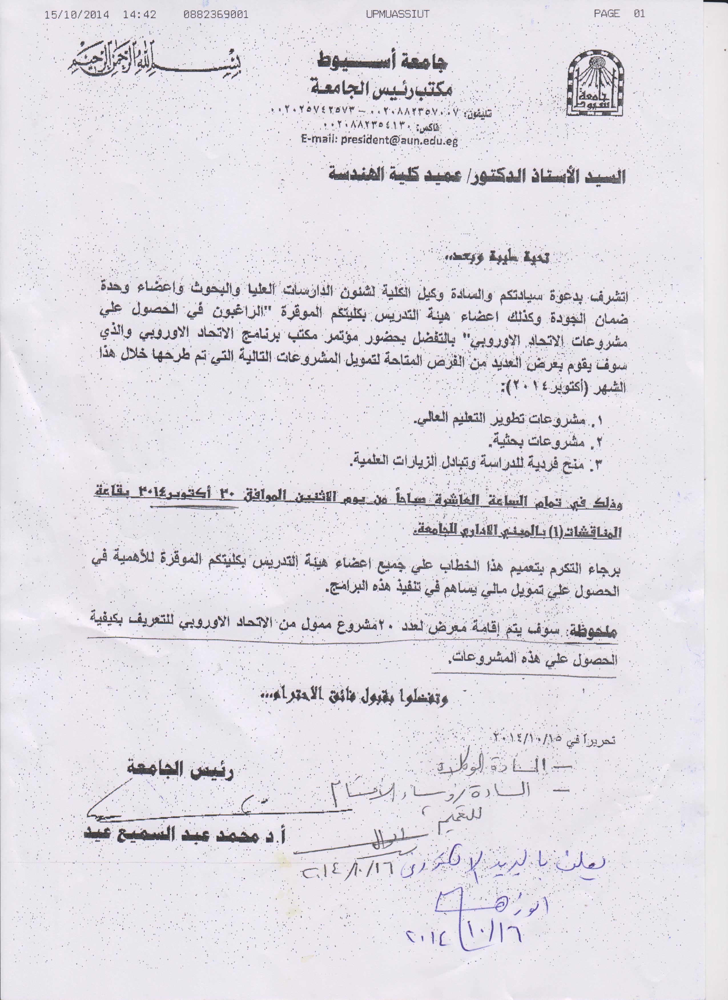 The president of Assiut University professor/ Muhammad Abd El-Samie invites the staff members of faculty of engineering to apply for European Union Funding Projects available in 30-10-2014 in the administration building  among the following projects:1- Developing The Higher Education2- Research Projects3-Individual Scholarships  and scientific exchange
