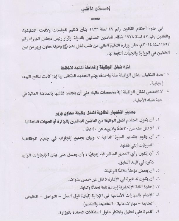 The ministry of higher education requires four assistants among the permanent employees of the university.The mission of those assistants will be only for one year and will be extended if they achieved progress in their fields.the terms of consitions are in the following announcement.