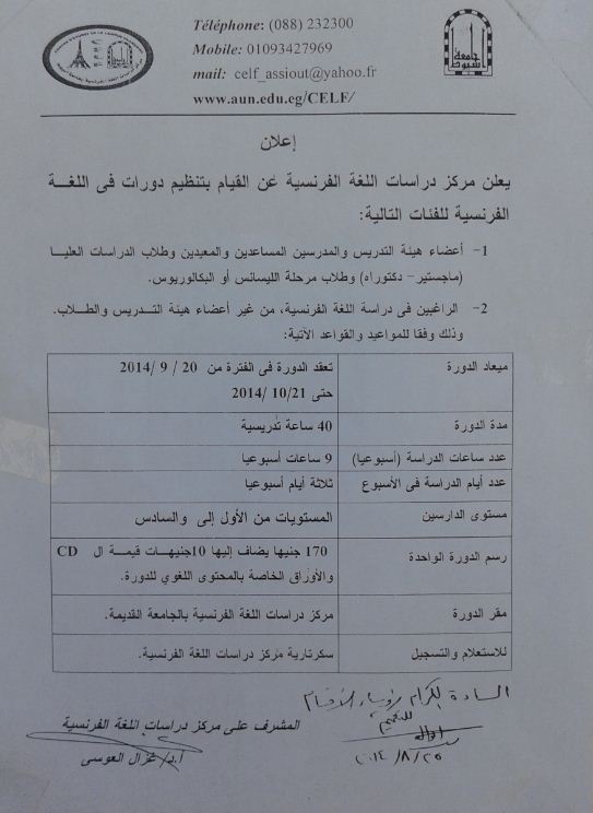 The french studies center will hold french courses  for faculty staff, demonstrators, postgraduate students(Master & PhD) and undergraduate students.The course is also available for anyone who wants to study french. The duration of the course: (20-9-2014 / 21-10-2014).Hours in the week: 9 hours (40 hours)No. of days of study: 3 daysLevels: From level 1 to level 6CostS: 170 L.E + 10 L.E for the material