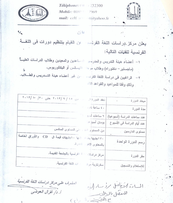 The french studies center will hold french courses  for faculty staff, demonstrators, postgraduate students(Master & PhD) and undergraduate students.The course is also available for anyone who wants to study french. The duration of the course: (15-9-2013 / 30-10-2013).Hours in the week: 6 hours No. of days of study: 2 daysCost: 170L.E+10L.E for the material