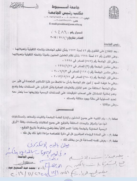 The office of the president of Assiut University sent an important announcement about the signature of the employees. It must have the full name and the date of receiving these documents. Anyone who violates this procedure will be punished.