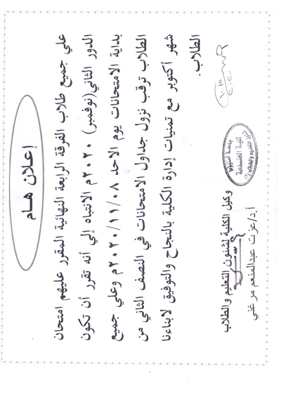 All students of the final 4th Division are scheduled for the second round exams (November 2020) Attention to the fact that it was decided that the beginning of the exams will be on Sunday 8/11/2020 and at allStudents expect to drop exam schedules in the second half of October With the wishes of the college administration to success and success to our students The College's Undersecretary for Education and Student AffairsDr. Ezzat Abdel Moneim Marghani