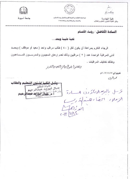 The vice dean for student affairs sent a letter to the heads of the departments to appoint at least one observer (demonstrator or employee) for every 40 students to avoid the exhaustion of demonstrators, assistant lecturer and lecturers and to save money.