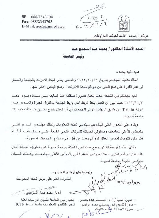The internet service in assiut university is back to work from sunday 3-11-2013 (7:00 p.m) after fixing the connected wires that links the university to the central of giza and which is hired from te-data company. this indicated that the malfunction of assiut university network was not from the university.