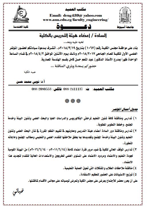 Based on the approval of the College Council No. (1067) dated 19/3/2018. I have the honor to invite you to attend the first scientific conference of the College for the academic year 2017/2018 on Monday, 2/4/2018 at 1 pm at the auditorium of Prof. Dr. / Abdel Moneim Hassan Kamel Department of Architecture.