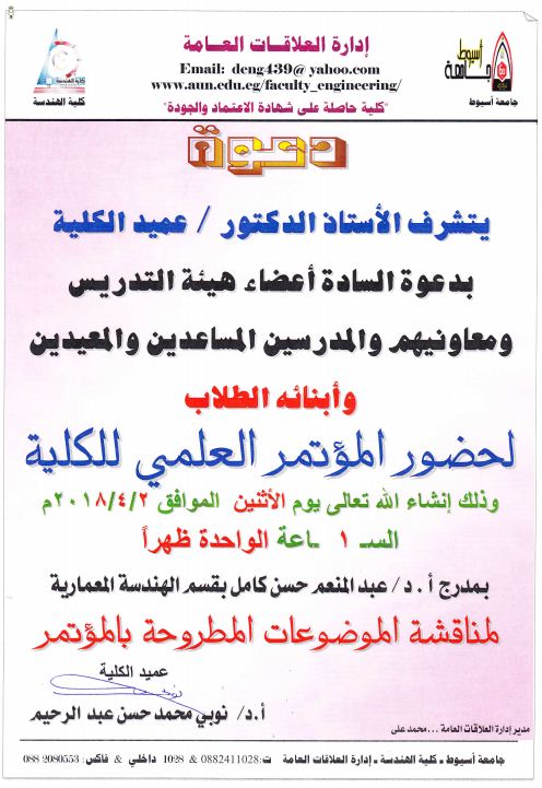 An invitation from the Dean of the Faculty of Engineering to attend the scientific conference of the College 27 March 2018 An invitation from the Dean of the Faculty of Engineering to attend the scientific conference of the College