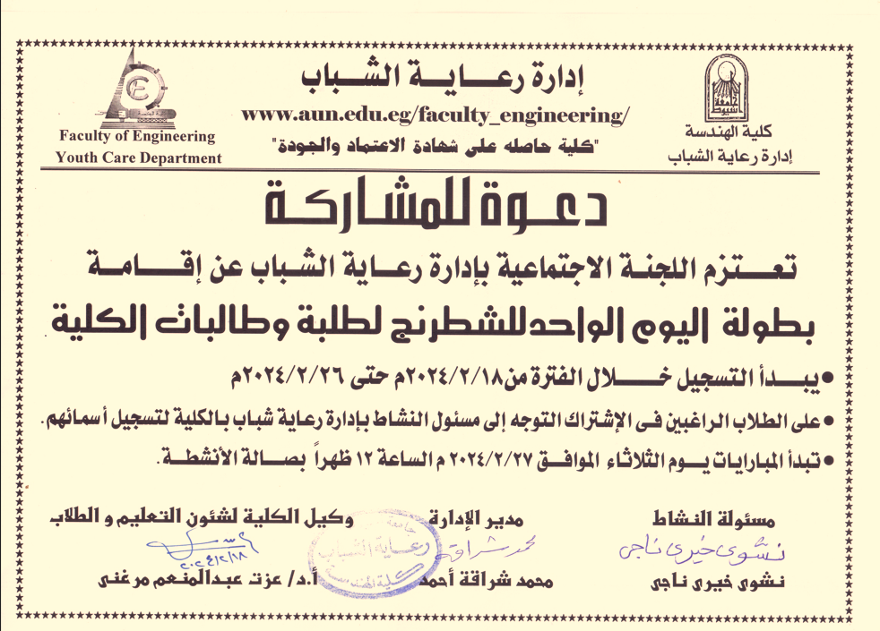 An invitation to participate in the one-day chess tournament for students of the College of Engineering 18 February 2024