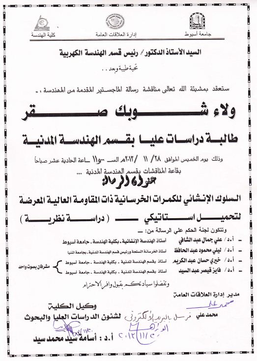 A Master Thesis in Civil Department 28-11-2013 21 November 2013 The civil engineering department has approved to form a jury committee to evaluate the master thesis proposed by eng Walaa Shobak Sakr, a postgraduate student, on Thursday at 11.00 a.m. in the discussion hall in civil engineering department.