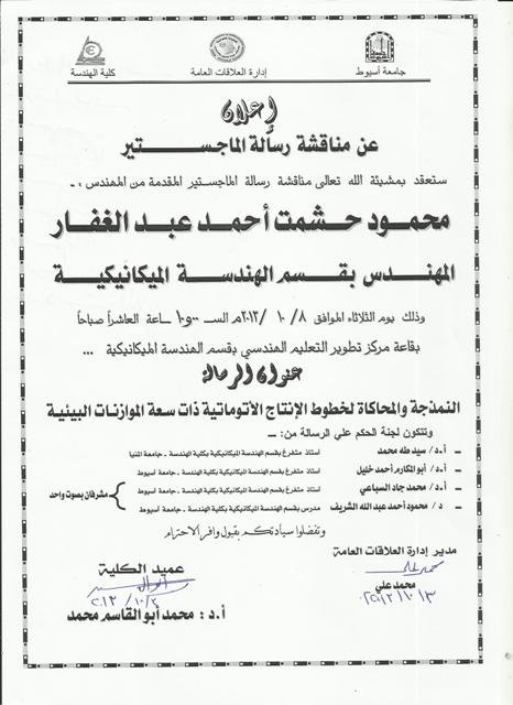 The mecahnical engineering department has approved to form a jury committee to evaluate the master thesis proposed by eng Mahmoud Heshmat Ahmad Abd El-Kader on Tuesday8 -10-2013 at 10.00 a.m. in the education development center in the mechanical department.