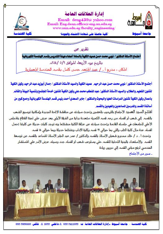 Meeting of Prof. Dr. Noubi Mohamed Hassan, Dean of the faculty and faculty members of the Department of Electrical Engineering 10 May 2018 Meeting of Prof. Dr. Noubi Mohamed Hassan, Dean of the faculty and faculty members of the Department of Electrical Engineering
