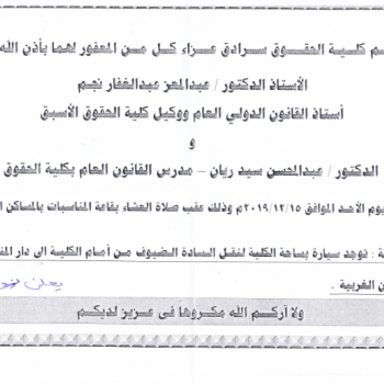 The Law School organizes a funeral marquee for:Prof. Dr. Abdul Mu'izz Abdul Ghaffar NajmProfessor of Public International Law and Former Solicitor of the Faculty of LawAndDr. Abdul Mohsen Sayed…
