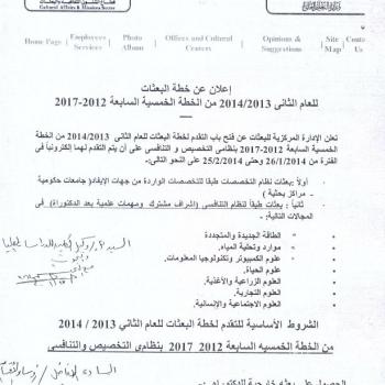 The central administration of the central affairs and missions sector announces its mission plan for 2013/2014. Staff members and researchers can apply online from 26-1-2014 to 25-2-2014
