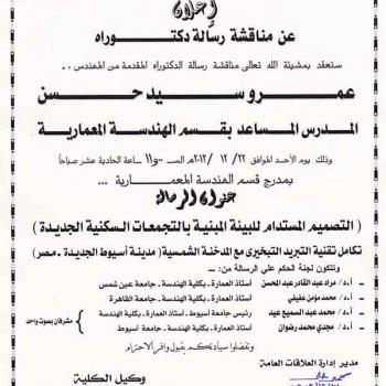 The architectural engineering department has approved to form a jury committee to evaluate the PhD thesis proposed by eng/ Amr Sayed Hassan (assistant lecturer in architectural department) on Sunday…