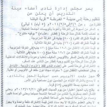 Faculty staff club is organizing a trip to Hurghada for 6 days (5 nights) in the mid-term vacation from 26-1-2014 to 31-1-2014.