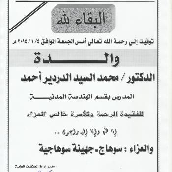 The faculty of engineering would like to express its deepest condolences to Dr. Muhammad Sayed El-Dardir; lecturer of civil engineering, for the death of his mother.
