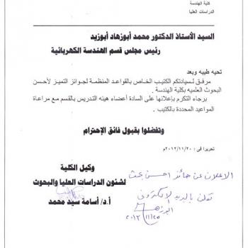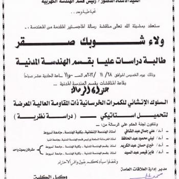 The civil engineering department has approved to form a jury committee to evaluate the master thesis proposed by eng Walaa Shobak Sakr, a postgraduate student, on Thursday at 11.00 a.m. in the…