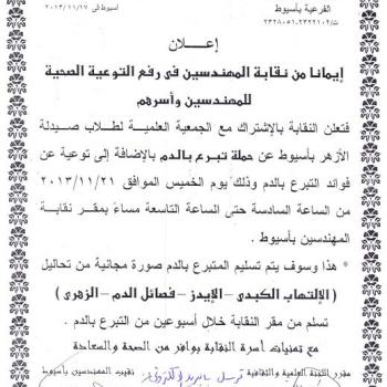 The egyptian syndicate of engineers in cooperation with the scientific society of students in assiut (faculty of pharmacy - Al Azhar university ) will start a blood donation campaigns to raise the…