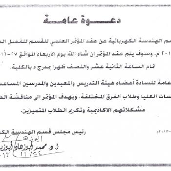 The electrical department will hold its scientific conference for the first term 2013-2014 on Wednesday 27-11-2013 at 12:00 in the amphitheatre of the faculty. The conference aims to discuss the…