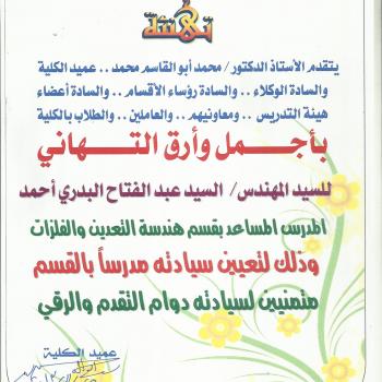 The dean of the faculty professor Muhammad Abo El-Kassem and all the faculty staff ane employees would like to congratulate Dr. Alsayed Abd El-Fattah El-Badry Ahmed for being appointed as a lecturer…