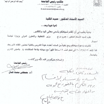 The faculty members are invited to meet the minister of planning and international cooperation, Professor/Amr Darag who is visiting Assiut university to attend the meeting that will be held on Sunday…