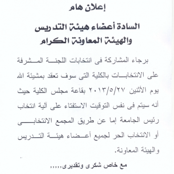 The supervisory committee for the faculty elections will be elected in the committee hall.The faculty members and the instructors are asked to attend these elections and there will be also a…