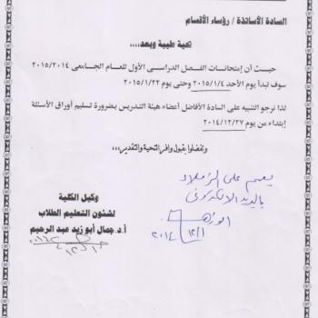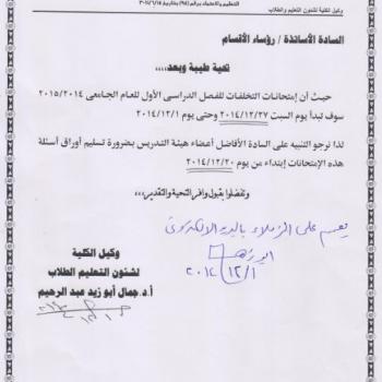 The first semester exams for the academic year 2014/2015 will start from Sunday 1-4-2015 to 22-1-2015. The faculty staff must deliver their exam papers on 27-12-2014