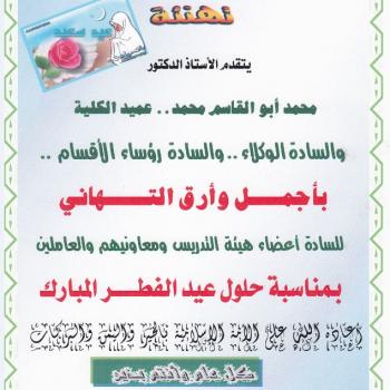 The dean of the faculty, Professor/ Muhammad Abo El-kasem, and all the faculty staff and employees extend their wishes to Dr. Muhammad El-Sayed Hosny for being promoted as an assistant professor in…