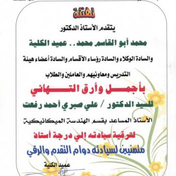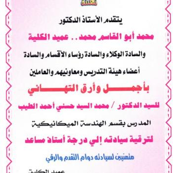 The dean of the faculty, Professor/ Muhammad Abo El-kasem, and all the faculty staff and employees extend their wishes to Dr. Ali Sabry Ahmad Refaat for being promoted as a professor in mechanical…